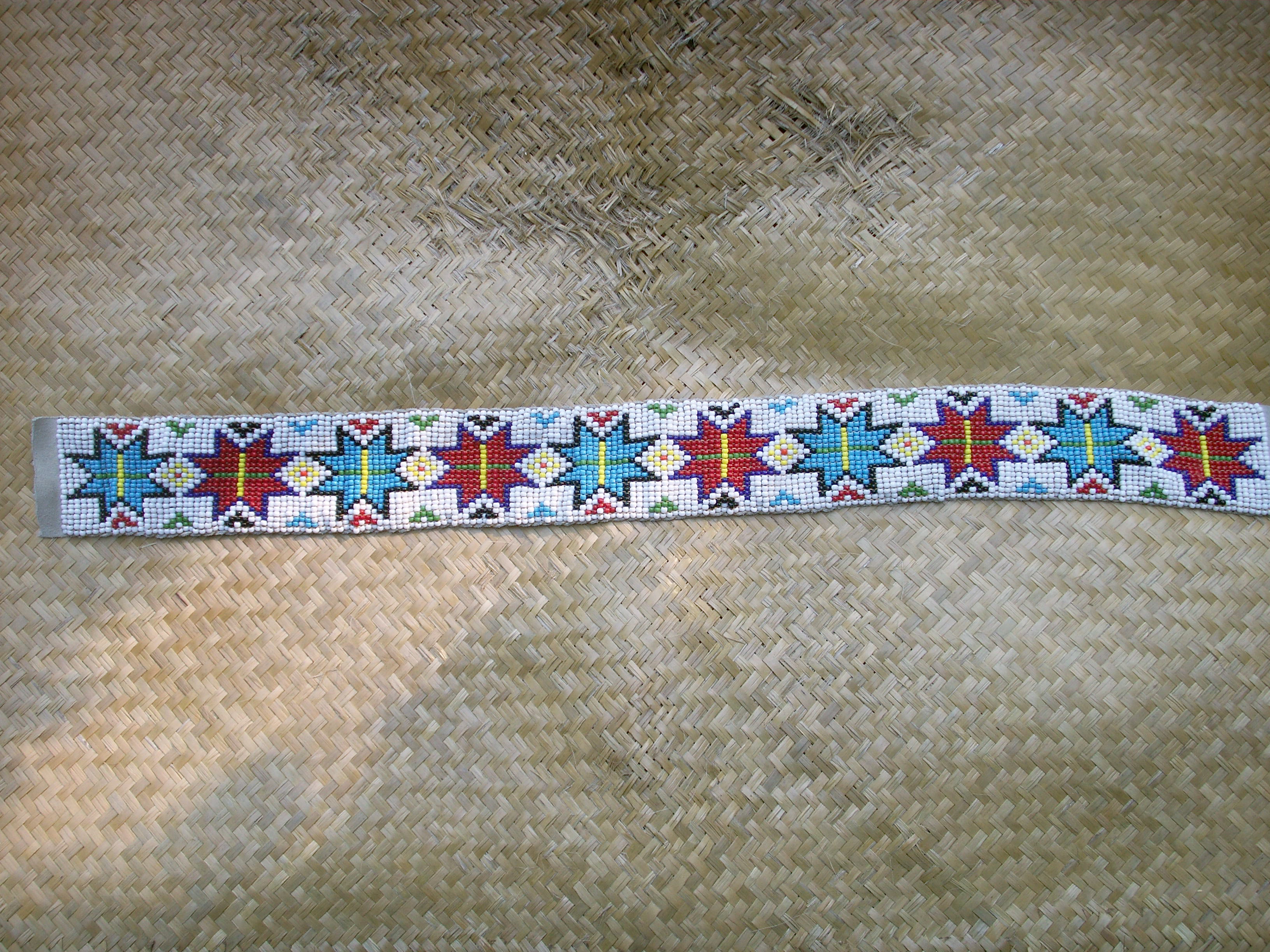 Melinda Carriker notes, "This belt uses size 4 mm French glass beads and is based on a picture of Washington Delegates. The gentleman seated on the left side of the photo has a beaded belt on. I made the belt using the loom-free beading technique and sewed it to a leather backing, using artificial sinew for all of it."