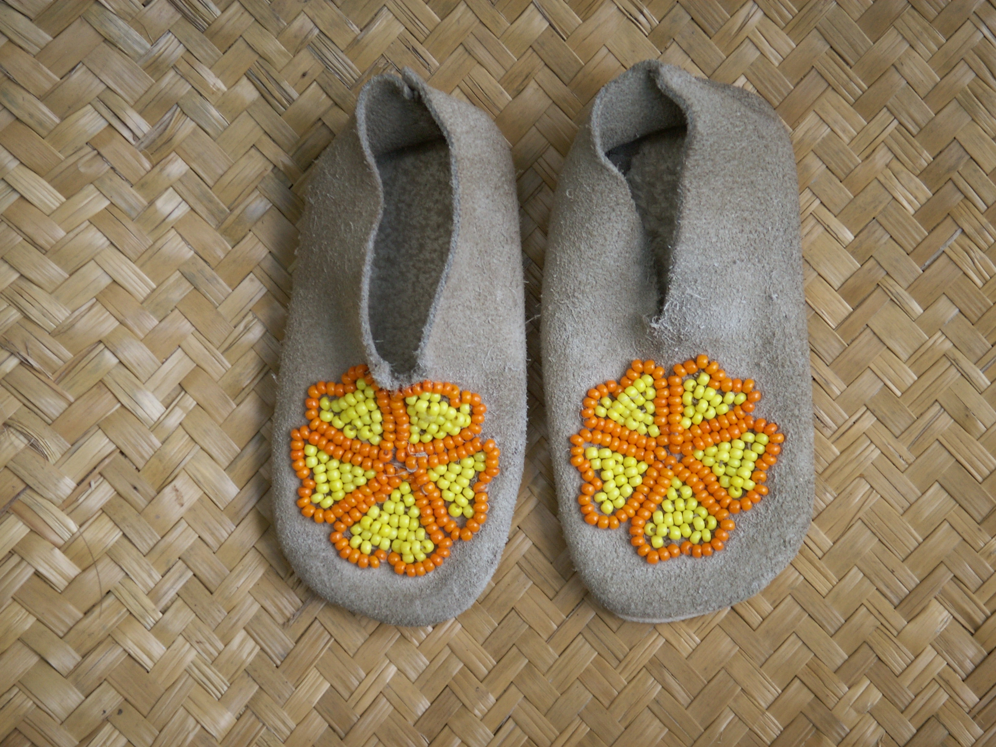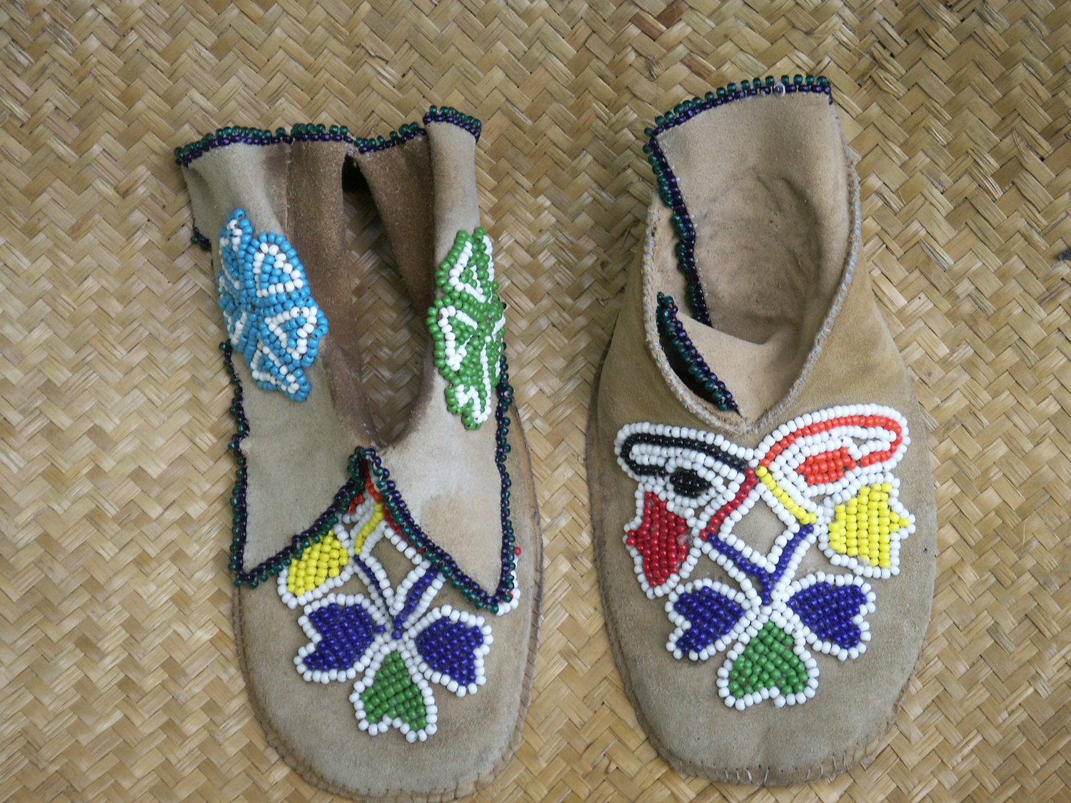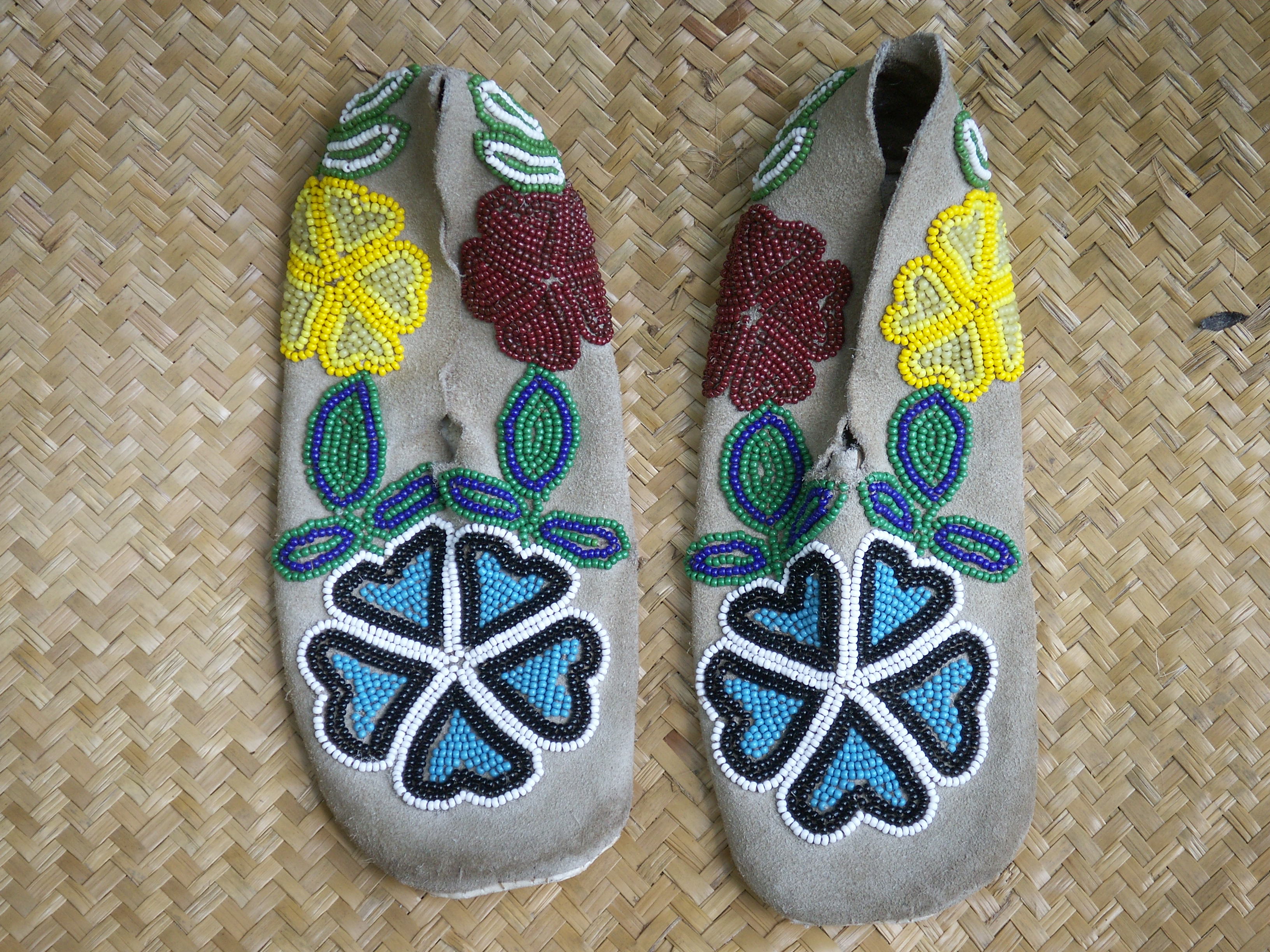 The third and fourth row of photos are shoes that Melinda Carriker made based on the designs of the shoes at the Milwaukee Public Museum. She used French glass beads size 4 mm for shoes 1-2 and the baby shoes and size 8/0 for shoe 3.