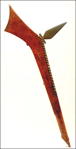 Ioway (?) Gunstock Club c. 1800-1850 Given as from Nebraska. 25 and 1/2 in. Wood (maple), iron blade, brass tacks.