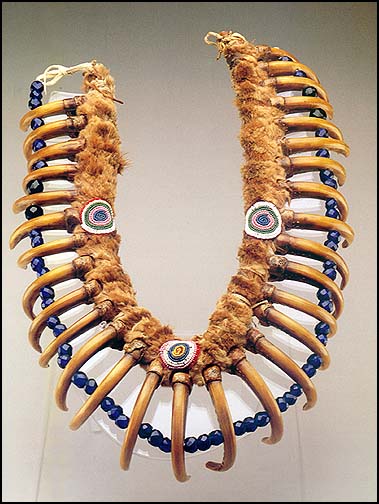 Iowa Bear Claw Necklace, Nebraska 17 in. long. Otter pelt, grizzly bearclaws, glass beads. Repatriated from the Detroit Institute of Arts to the Iowa Tribe of Kansas and Nebraska. On display at the Iowa Tribal Office and Museum. Belonged to the Iowa Chief White Cloud (Notch-ee-ming-a), painted by George Catlin.