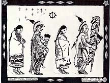 Illustration: "Powwow" by Lance Foster The Iowa Indians (or Ioway Indians) lived in Iowa for ages untold. Long ago, after the harvest of crops in the fall, there was a time of celebration and dancing. Men and women joined together to celebrate life and the success of the past year. Although the Ioway were moved from Iowa and onto a reservation in Kansas by 1836, and some eventually went to Oklahoma, the tradition of celebrating life through dancing continues up through today.