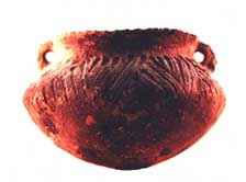 olla form, the handles, shoulders and lip decorated with trailing, incising, and
